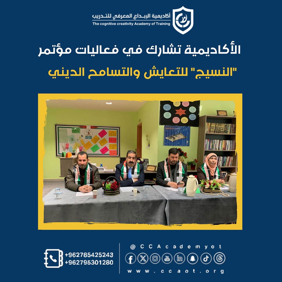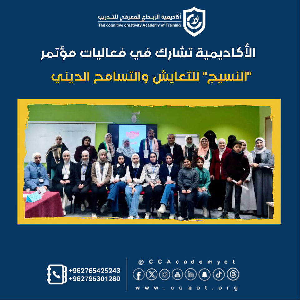 شاركت الدكتورة نجاح النوايسه ق.أ بإدارة الجودة والتطوير ممثلة عن أكاديمية الإبداع المعرفي للتدريب بورقة حول التعايش والتسامح الديني بمؤتمر تحت عنوان " النسيج " والذي أقيم برعاية عطوفة مدير تربية المزار الجنوبي بمحافظة الكرك، وبتنظيم من مدرسة رقية بنت الرسول الأساسية المختلطة، وتحدثت النوايسة في الورقة النقاشية حول قصص النجاح "التسامح والتعايش في الأردن"، وقد أشارت اثناء الحديث الى رسالة عمان، وكلمة سواء، واسبوع الوئام والتسامح، وجائزة تمبلتون التي منحت لجلالة الملك عبدالله الثاني وذلك لدور جلالة الملك المميز حول التعايش والتسامح الديني.وفي نهاية الورقة قدمت النوايسة بطاقة تهنئة لجلالة الملك عبدالله الثاني ابن الحسين بمناسبة يوم العلم الأردني والذي يصادف السادس عشر من شهر نيسان من كل عام.